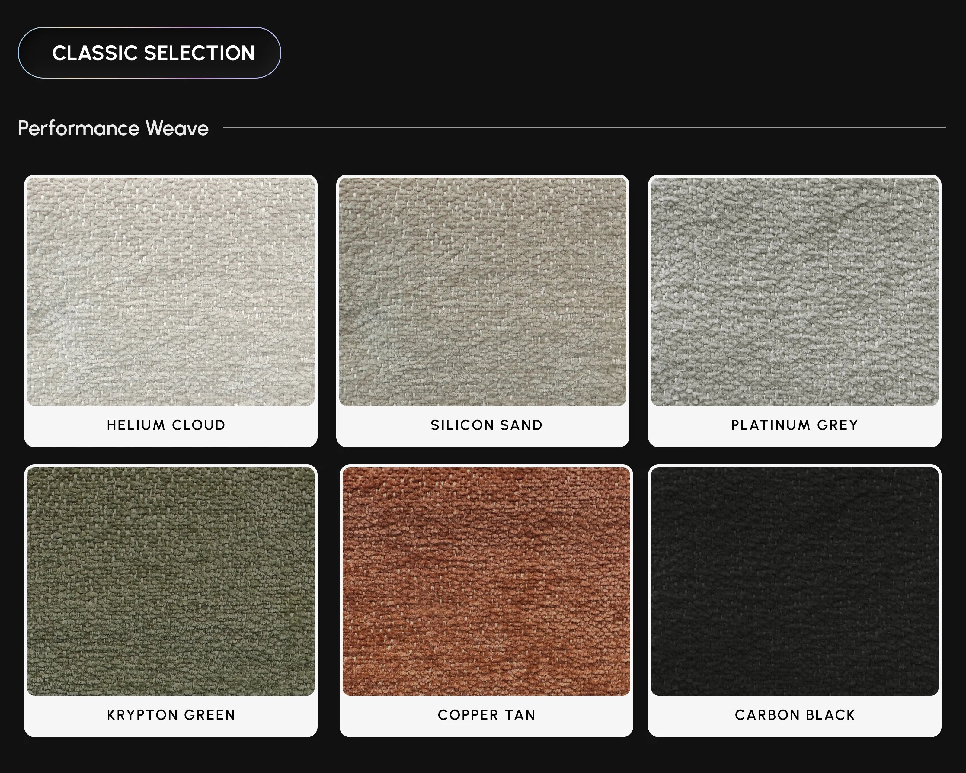 The Signature Selection – Featuring 9 of our latest colors and fabrics, each one representing a breakthrough in design thinking: beautiful colors, elevated textures, and the perfect balance of innovation and luxury. Here you will find – Shearling: Almond, Fawn, and Espresso. Chatou Bouclé: Pearl. Performance Corduroy: Lunar Dune, Comet Ivory, Nebula Blue, Terraform Green, Dark Matter.