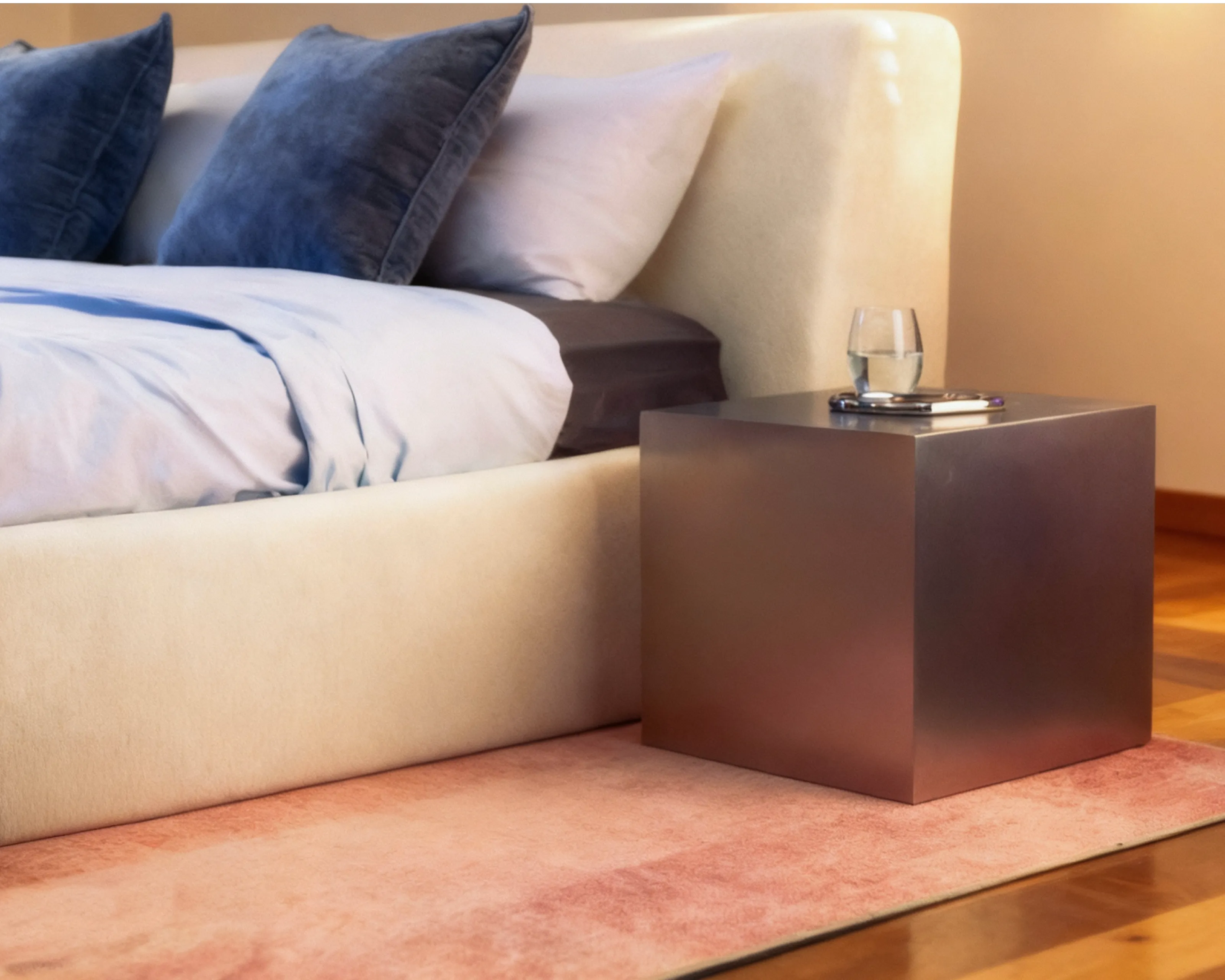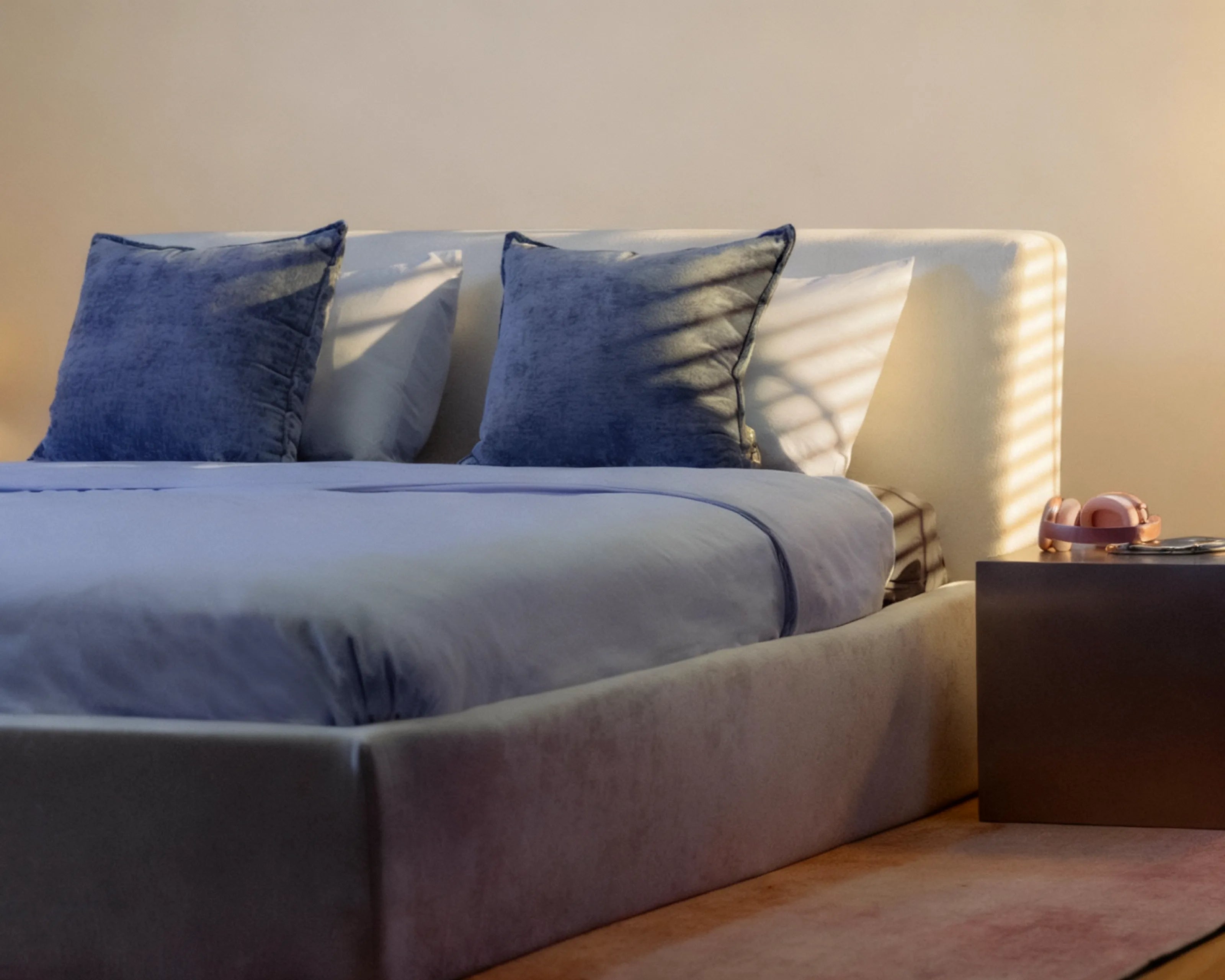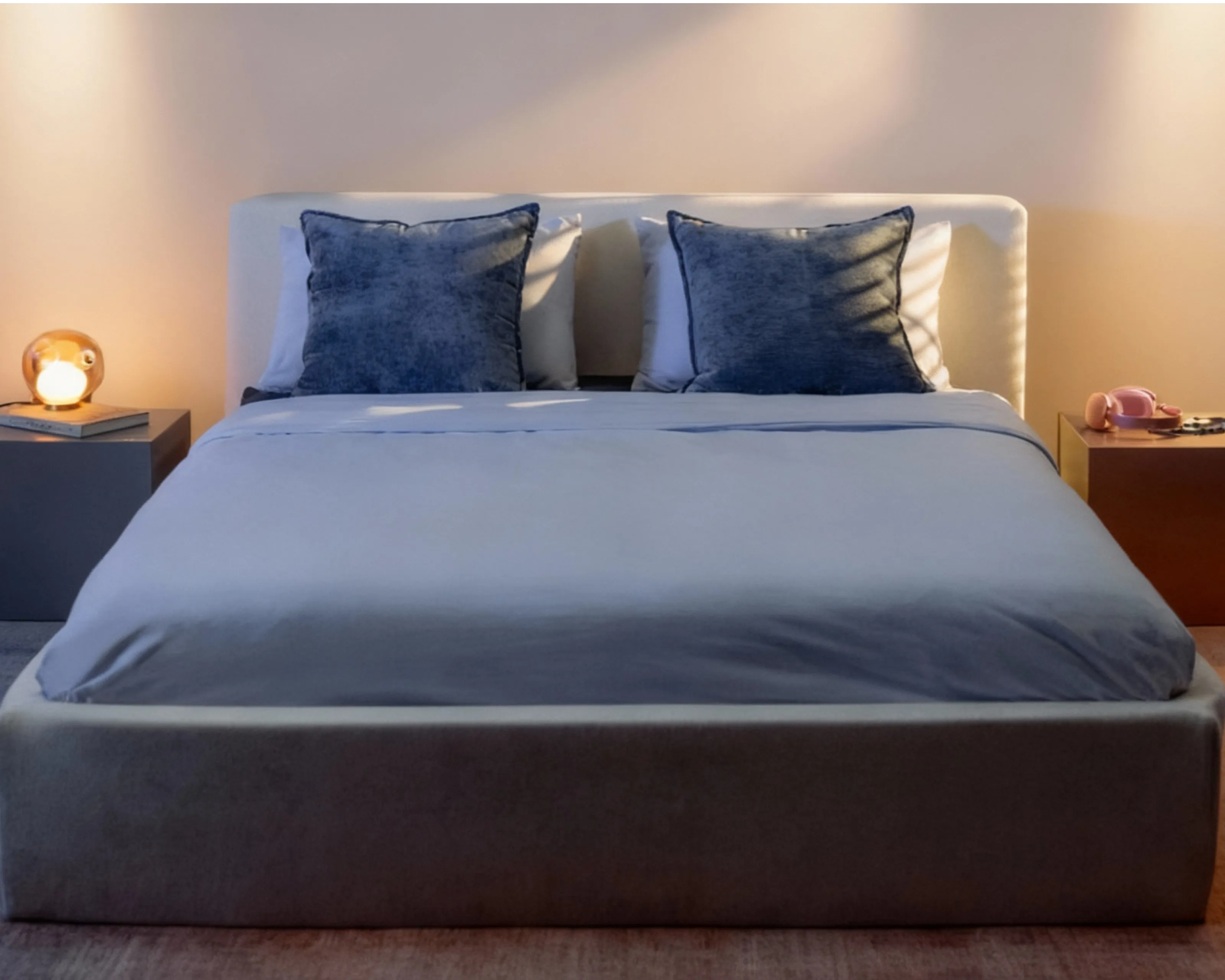 The O2 Bed blends modern design with intelligent functionality. Its minimalist, boxy structure features a low-set profile, creating a sleek and understated aesthetic. High-density foam cushioning is elegantly rounded, delivering the perfect balance of firmness and comfort.