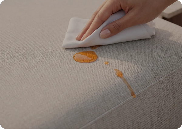 Solar Weave Fabric™ naturally repels liquids and dries quickly. For marks, use warm water and gently dab with a clean cloth. Solar Weave is also bleach-cleanable. The fabric is engineered to handle everyday outdoor messes, from sunscreen and snacks to wet paws.